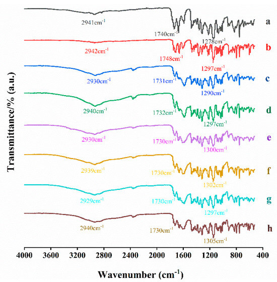 Fourier transform infrared spectroscopy (FTIR) spectra were obtained using a Nicolet iS20 FTIR (Thermo Fisher Scientific Co., Ltd., Waltham, MA, USA) equipped with an attenuated total reflectance accessory. Spectra were collected with OMMIC Software over the range of 4000–450 cm−1 (16 scans, resolution of 4 cm−1).