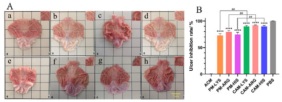 Stomach anatomy images (A) and the inhibition rate (B) of (a) ACM, (b) PM-Lys, (c) PM-Arg, (d) PM-His, (e) PBS, (f) CAM-Lys, (g) CAM-Arg, and (h) CAM-His. The scale bar represents 1 cm (n = 4, **** p < 0.0001 vs. ACM and ## p < 0.001 vs. PM groups).