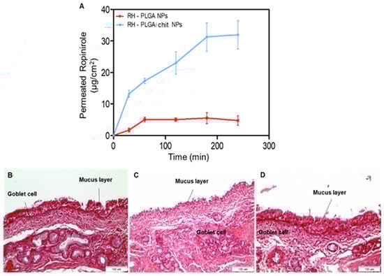 Ex vivo permeability studies of RH loaded from PLGA and PLGA/chit NPs across sheep nasal mucosa. (A) Permeability studies across nasal mucosa at several time points (PLGA NPs in red color, PLGA/chit NPs in blue color). Results are presented as mean value ± SEM, n ≥ 3. Histopathological studies of (B) untreated and (C) treated nasal mucosa with RH loaded PLGA NPs and (D) RH loaded PLGA/chit NPs after 4 h incubation. Scale bar: 100 μm, Adopted with permission [].