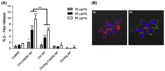 Evaluation of mast cell activation by nanoparticles. (A) Degranulation of the mast cell line HMC-1 was evaluated by a β-hex release assay. Cells were stimulated with C48/80 at 20, 40 or 80 μg/mL in solution or incorporated in nanoparticles. Blank Chi NP and Chi/Alg NP were used as controls at the same concentration of nanoparticles tested with C48/80 loaded particles. Not only Chi-C48/80 NP but also Chi NP induced a higher % of β-hex release than C48/80 in solution and Chi/Alg-C48/80 NP, indicating the intrinsic ability of Chi NP to activate mast cells. Data are representative of three independent experiments performed in triplicate or quadruplicate, mean ± SD, n = 3. Symbols above bars indicate the differences relative to C48/80 in solution, * p < 0.05, ** p < 0.01, *** p < 0.001 2-way ANOVA (B) Confocal images of HMC-1 before (B1) and 2 min after treatment with FITC labeled Chi-C48/80 NP (green) at a dose corresponding to 40 μg/mL of C48/80 in Tyrode’s solution (B2). Cells were labeled with Hoechst 33,342 (blue) for nuclei and with Alexa Fluor® 594 WGA to identify cell membranes. Images showed that Chi-C48/80 immediately adsorbed on the cell surface, Adopted with permission [].