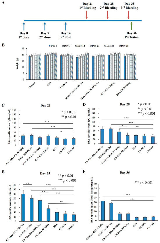 Immunization and sampling timeline (A); changes in body weight of mice (B); BSA-specific serum IgG (C–E) and nasal lavage fluid (NLF) IgA (F) antibody responses; all results are reported as mean (SD) (n = 6, * p < 0.05, ** p < 0.01, *** p < 0.001) [].
