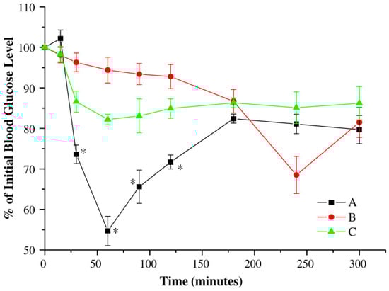 Plasma glucose levels in rabbits following nasal administration (at pH 7.4) of: A, insulin-loaded PE3gC24 nanoparticles suspended in PBS; B, insulin-PE3gC24 PBS suspension; C, insulin in PBS. Mean ± SD, n = 6. * Statistically significant differences from control insulin solution (p < 0.05), Adopted with permission [].
