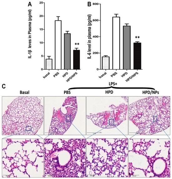 Impact of HPD and HPD/NPs on LPS-induced inflammation in mice. At 3 h post-LPS, PBS (vehicle), HPD, or HPD/NPs were nasally administered to mice. Lung tissues were collected at 24 h post-LPS challenge. (A) Expression levels of IL-1β and (B) IL-6 in mouse plasma at 24 h post-LPS challenge (n = 4/group; ** p < 0.001 vs. PBS vehicle and vs. HPD). (C) Representative micrographs of H&E-stained lung tissue cross-sections at 24 h post-LPS challenge. Scale bar, 1 mm (upper row) or 100 μm (lower row) [].