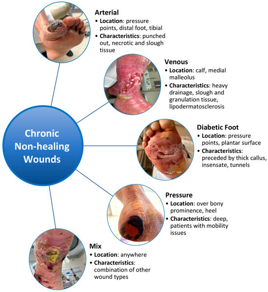 Chronic non-healing wounds impact more than 6.5 million Americans and currently incur an annual healthcare cost of more than 25 billion dollars [1]. The prevalence and cost of chronic non-healing wounds are expected to increase with the rise of aging populations, diabetes, obesity, and cardiovascular disease. The etiology for a chronic non-healing wound may vary from arterial insufficiency, venous insufficiency, diabetes, pressure, and/or mixed presentations (Figure 1) [2]. Untreated lower extremity wounds can lead to severe infections, necessitating major lower extremity amputation for infection control and/or pain management. This process can significantly impact patients’ ability to work and move independently, especially for those with limited resources [3,4]. Treating lower extremity wounds poses several challenges, often involving multiple medical specialties and lasting up to 12 to 13 months on average, if successful [5,6,7]. Recurrence rates of lower extremity wounds affect up to 60% to 70% of patients, leading to functional loss and reduced quality of life [7,8,9]. Given these challenges and the increasing prevalence of non-healing lower extremity wounds, developing effective drug therapies is crucial.