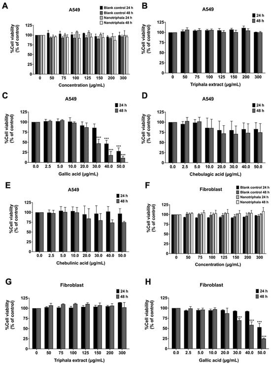 3.7. Effect of Nanotriphala and Its Bioactive Compounds on Cell Viability of A549 Cells