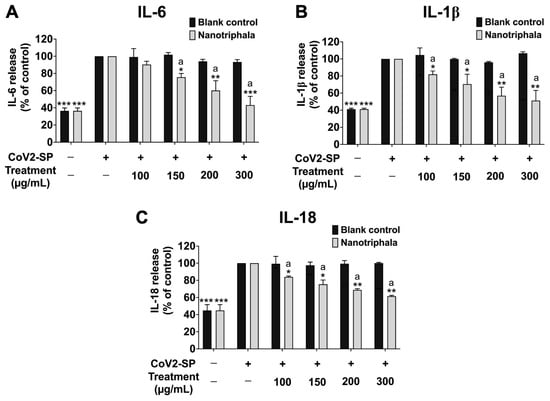 APA StyleChittasupho, C., Umsumarng, S., Srisawad, K., Arjsri, P., Phongpradist, R., Samee, W., Tingya, W., Ampasavate, C., & Dejkriengkraikul, P. (2024). Inhibition of SARS-CoV-2-Induced NLRP3 Inflammasome-Mediated Lung Cell Inflammation by Triphala-Loaded Nanoparticle Targeting Spike Glycoprotein S1. Pharmaceutics, 16(6), 751. https://doi.org/10.3390/pharmaceutics16060751