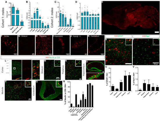 The expression of AAVPHP.eB-CYP46A1 was mapped on the brain sections (n = 4) using multiplex IF staining in 6-week-old Mecp2 KO mice using antibodies against HA, NeuN, GFAP, Iba1, and calbindin to visualize on the same tissue the protein expression and different kinds of cells (neurons, astrocytes, microglial cells, and Purkinje cells) so as to determine the cell tropism of the vector. Quantification was carried out on the percentage of HA-positive cells in each cell type of the brain. In accordance with the biodistribution profile, hCYP461-HA expression was detected in several brain areas (Figure 2E) of the treated Mecp2 KO mice, such as the cerebral cortex (Figure 2F), striatum (Figure 2G), thalamus (Figure 2H), hippocampus (Figure 2I), hypoglossal nuclei of medulla (Figure 2J), and cerebellum (Figure 2K). The majority of hCYP46A1-HA-positive cells were neurons (80–90%) and astrocytes (10–20%), and less than 1% were microglial cells (Figure 2R,U,V). However, this percentage varied in the functions of sub-areas of the brain. Indeed, 13% of the cerebral cortex neurons co-expressed hCYP46A1-HA, but this was mainly in layer V of the cerebral cortex, where the majority of cells are transduced by the vector (Figure 2L). In the striatum, weak transduction of the vector was observed with 0.4% of the neurons and h-CYP46A1-HA-positive cells (Figure 2M,R). In the thalamus, around 27% of the neuronal cells were transduced by the vector (Figure 2N,R). In the hippocampus, it was essentially in layer CA2/CA3 where the vector was transduced—i.e., 50% of cells (Figure 2O,R). In the medulla (Figure 2P,R), 50% of neurons were transduced, but the hypoglossal nucleus and motor nucleus of trigeminal are nuclei localized in the medulla, where 90–95% of the neurons were transduced, while 85% of the Purkinje cells were transduced by the vector (Figure 2Q,R). On the contrary, we detected between 2.4% and 17% of the astrocytes transduced by the vector (Figure 2S,U) and less than 1% of the microglial cells (Figure 2T,V).