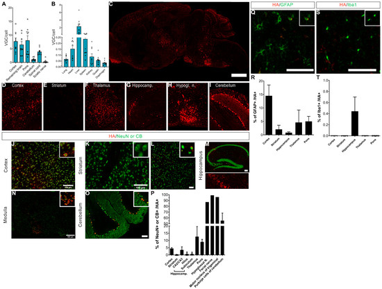 Similarly, in the treated Mecp2 males, hCYP461-HA expression was detected in several areas of the brain (Figure 3C) of the treated Mecp2 KO mice, such as the cerebral cortex (Figure 3D), striatum (Figure 3E), thalamus (Figure 3F), hippocampus (Figure 3G), hypoglossal nuclei of medulla (Figure 3H), and cerebellum (Figure 3I). The majority of hCYP46A1-HA-positive cells were neurons (n = 4; Figure 3P,R,T). This percentage varied in the functions of sub-areas of the brain. The repartition of hCYP46A1-HA-positive cells seems to be weaker in the treated Mecp2+/− females than in the treated Mecp2 KO males. Indeed, 5% of cerebral cortex neurons were co-expressed with hCYP46A1-HA (against 13% in the males; Figure 3J). In the striatum, weak transduction of the vector was observed with 0.06% of neurons and h-CYP46A1-HA-positive cells (Figure 3K,P). In the thalamus, around 13% of neuronal cells were transduced by the vector (versus 27% in the males; Figure 3L). In hippocampus, it was essentially in layer CA2/CA3 where the vector was transduced—i.e., 3.4% of cells (versus 50% in males; Figure 3M). In the medulla (Figure 3N), 9% of the neurons were transduced (versus 50% in the males), but the hypoglossal nucleus or facial nerve or motor nucleus of trigeminal are nuclei localized in the medulla, where 87–98% of the neurons were transduced. This percentage was similar in the males. The vector transduced 55% of the Purkinje cells (versus 85% in the males, Figure 3O). On the contrary, we detected 14% of the astrocytes transduced in the cortex, inferior to 5% in other areas of the brain (Figure 3Q,R) and less than 0.5% of microglial cells in the brain (Figure 3S,T).