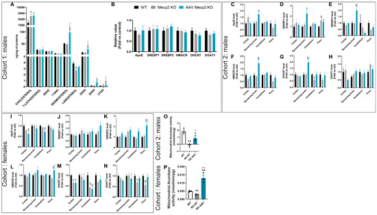 Cholesterol is a major lipid component of brain cell membranes, accounting for 20% of the body’s total cholesterol content. It plays a crucial role in brain development, synaptogenesis, neuronal activity, neuron survival, learning, and memory. Cholesterol does not freely cross the blood–brain barrier (BBB), and nearly all cholesterol in the adult brain is synthesized in situ by astrocytes [18,19]. The cholesterol abundance in the CNS depends primarily on local synthesis and efflux. However, cholesterol cannot be exported directly from the brain. It is converted to 24(S)-hydroxycholesterol (24-OHC) by cholesterol 24-hydroxylase (encoded by CYP46A1 gene), a highly conserved cytochrome P450 enzyme, which is able to cross the BBB and enter the circulation to the liver to be further metabolized to bile acids [20,21,22]. Consequently, brain cholesterol content is determined by the balance between the pathways of in situ biosynthesis and cholesterol elimination via 24-hydroxylation catalyzed by CYP46A1. Indeed, cholesterol imbalance is associated with several neurodegenerative disorders such as Alzheimer’s disease (AD), Huntington’s disease (HD), Parkinson’s disease (PD), and Niemann–Pick type C disease [18,23,24,25,26,27]. Studies showed that the modulation of CYP46A1 activity by gene therapy or pharmacologic means could be beneficial in the case of neurodegenerative and other brain diseases [28]. For example, the neuronal overexpression of CYP46A1 by the injection of the adeno-associated virus (AAV) vector before or after the onset of amyloid plaque significantly reduces Aβ pathology in the mouse model of AD [29]. Likewise, AAVrh.10-CYP46A1 delivery in the striatum of HD mice protects them from motor pathology and neuropathological alterations [30] and is actually under clinical evaluation (NCT05541627). It has been reported that CYP46A1 expression increased by 38% over wild-type levels in Mecp2-deficient males aged up to 28 days (when mice display mild symptoms), indicating a heightened need for cholesterol turnover in neurons. Its expression was downregulated when the mutant males were severely symptomatic (aged 56 days) [15,16].