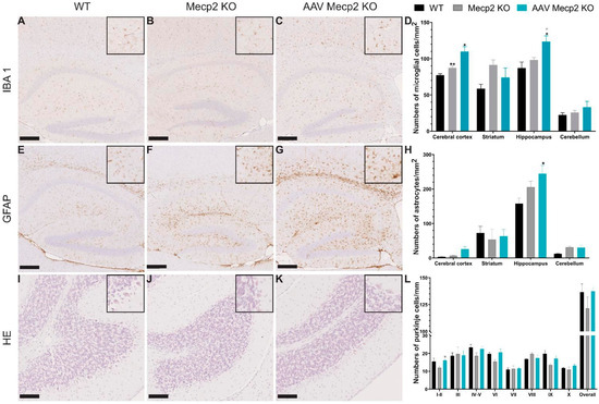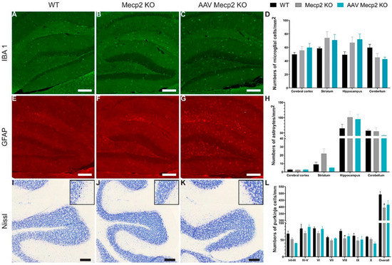 Wild-type (n = 3−5), Mecp2 KO (n = 4−5), or treated Mecp2 KO (n = 4−6, injection at three weeks and sacrificed at six weeks) male mice were used to perform histological analysis. Wild-type (n = 4), Mecp2 KO (n = 5), or treated Mecp2 KO (n = 3–4, injection at 12 weeks and sacrificed at 35 weeks) female mice were also used to perform histological analysis. Different staining methods were performed on the sagittal section of the brain in WT or treated male or female Mecp2 mice. Nissl and hematoxylin–eosin staining were performed on brain sections according to the standard protocol.