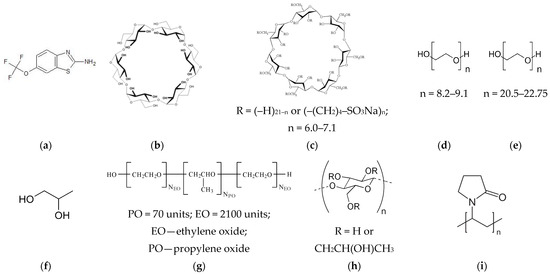 Structures of RLZ, cyclodextrins and polymers used in this study: (a) riluzole (RLZ), (b) α-cyclodextrin (α-CD), (c) sulfobutylether-β-cyclodextrin (SBE-β-CD), (d) polyethylene glycol 400 (PEG 400), (e) polyethylene glycol 1000 (PEG 1000), (f) propylene glycol (PG), (g) pluronic F127 (F127), (h) hydroxypropylmethylcellulose (HPMC), (i) polyvinylpyrrolidone 29–32 (PVP).
