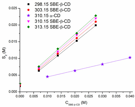 The solubility of RLZ in the solutions of pH 2.0 (final pH 2.7), pH 4.0, pH 6.8 and with the additions of α-CD and SBE-β-CD was determined at 310.15 K. In the medium of pH 6.8, the experiments were additionally carried out at 298.15 K, 303.15 K and 313.15 K in pure buffer and in the presence of several SBE-β-CD concentrations in order to disclose the thermodynamic aspects and to gain further knowledge on the mechanism of the inclusion process. The results are listed in Table 1. The phase diagrams in α-CD at 310.15 K and SBE-β-CD at different temperatures in buffer pH 6.8 are illustrated in Figure 2.