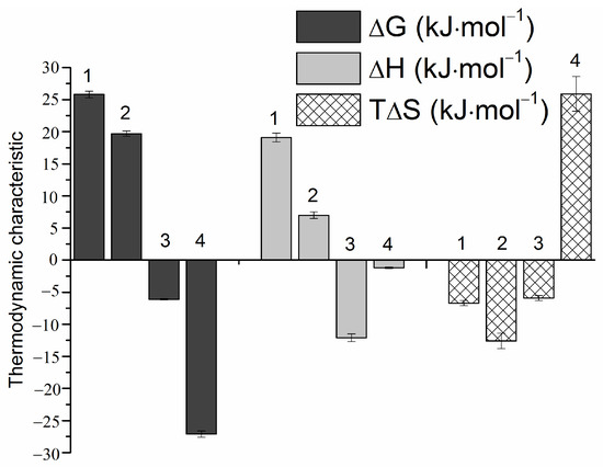 In the next step, the comparative analysis of the dissolution, complexation and solubilization thermodynamics was accomplished similarly to our previous studies [58,59]. To this end, the respective thermodynamic characteristics were calculated by Equations (6)–(12) using the mole fraction unitary units providing thermodynamic quantities for the standard state for RLZ in buffer pH 6.8 and taking the maximal SBE-β-CD concentration (4%) (Table 3). To observe visually the contributions to the driving force of the considered processes, a diagram in Figure 3 was constructed.