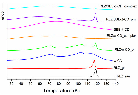 DSC curves for the studied samples: RLZ raw untreated (black), RLZ ground (red), α-CD (blue), RLZ/α-CD physical mixture (green), RLZ/α-CD complex (orange), SBE-β-CD (magenta), RLZ/SBE-β-CD physical mixture (violet), RLZ/SBE-β-CD complex (cyan).