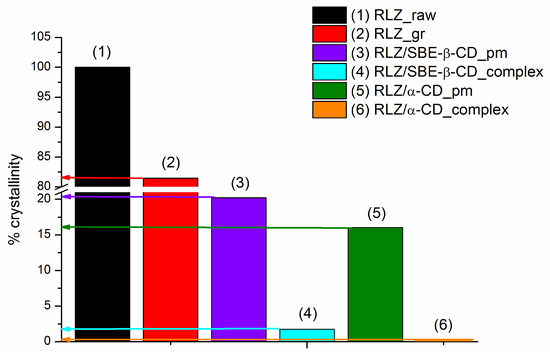 Figure 4 demonstrated a sharp endothermic peak between 118 °C and 119 °C typical of a crystalline anhydrous substance corresponding to the melting point of RLZ that is consistent with the literature [36,37]. The PXRD pattern of RLZ (Figure S5) also approved the crystallinity since the high-intensity sharp peaks were detected at 8.95, 13.46, 17.98, 19.22, 20.98, 22.52, 24.97, 26.43 (2Theta) diffraction angles. Expectedly, the ground sample of RLZ partly lost its crystallinity which is evident from both the DSC and PXRD illustrations. In order to assess quantitatively the crystallinity of the samples we determined the melting enthalpies from the DSC curves (discussed below). The thermogram of α-CD provided the endothermic peaks over broad temperature ranges at approximately 48–90 °C and 96–110 °C representing the evaporation of water on the surface and in the interstices as it was also reported by Ho et al. [67]. According to the DSC curve, SBE-β-CD has a characteristic broad endothermal effect of water loss in the range of 70–120 °C similar to that in the study of Ribero et al. [68]. PXRD examination approved the DSC results. PXRD pattern of α-cyclodextrin demonstrated strong crystallization according to the presence of many sharp peaks in the diffractogram [69,70], while the amorphous state of SBE-β-CD is reaffirmed by a hollow-like pattern [68]. The comparative analysis of all the investigated samples of RLZ with raw RLZ has led to the following conclusions. The endothermic melting peak of raw RLZ is slightly shifted by 2 °C towards lower temperatures after grinding accompanied by a slight (20%) crystallinity decrease. As follows from both the DSC (Figure 4) and PXRD (Figure S5) illustrations, the formation of physical mixtures results in essential loss of crystallinity due to the partial complexation at the solid state. This effect became more pronounced for the ground samples with both cyclodextrins. At the same time, the impact of complex formation is greater with α-CD as compared to SBE-β-CD. The effect of sample treatment on the residual share of uncomplexed drug was disclosed using Equation (18), and illustrated in Figure 5.