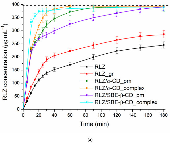 The value of the stability constant is considered a crucial factor for the absorption of drugs administered in the content of cyclodextrin complexes. Moreover, increasing the cyclodextrin concentration may worsen the bioavailability of the formulation and retard its progression to the market [30]. For poor soluble lipophilic drugs (RLZ belongs to) a moderate binding constant of drug/CD ˂ 5000 M−1 [53] is appropriate for successful oral delivery. This is the case of RLZ/SBE-β-CD. At the same time, the drug is rapidly released from the complex with a low binding constant ˂ 200 M−1 (RLZ/α-CD in our study) which would reduce bioavailability. Drug/CD complexes with high stability are characterized by a slow rate of drug release leading to a decrease in the free drug fraction available for permeation through the membranes and low absorption.
