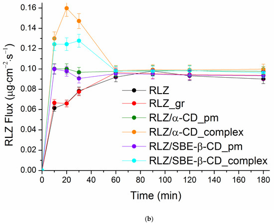 The combined dissolution/permeation (D/P) approach has been introduced and tested [71,72,73] as a promising profit-proven tool for the simultaneous evaluation of mutually dependent processes of dissolution and permeation in dynamic conditions. This issue is becoming extremely urgent if cyclodextrins are used in formulations, and the dissolution rather than permeation through the intestinal membrane is often the rate-limiting step in drug absorption [74]. In this study, the dissolution/permeation tests were carried out in buffer solutions pH 6.8 where the solubility of RLZ was shown to be insufficient. First of all, the solid samples of RLZ raw untreated (RLZ_raw), RLZ ground (RLZ_gr), RLZ/α-CD physical mixture (RLZ/α-CD_pm), RLZ/α-CD complex (RLZ/α-CD_complex), RLZ/SBE-β-CD physical mixture (RLZ/SBE-β-CD_pm), RLZ/SBE-β-CD complex (RLZ/SBE-β-CD _complex) were subjected to the experiments in which the cellulose membrane MWCO 12–14 kDa (RC) was used as a barrier. The kinetic curves of the dissolution/release and permeation from the solid samples were obtained and are illustrated in Figure 6a and Figure S5. Figure 6b shows the fluxes derived from the permeation profiles which are informative in terms of better visualization of the variations in the permeation process. Since various formulations of RLZ were studied in this section, to avoid the experimental difficulties associated with quantification of the molecularly dissolved fraction of the drug the flux was used instead of the apparent permeability coefficient usually used to assess the ability to pass the membrane [73].