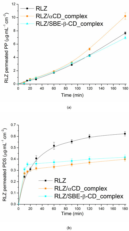 Analysis of the data in Table 4 demonstrated the reduction in the permeability coefficients upon the increase in CD concentration in the solution. This reduction is more pronounced with SBE-β-CD (3.7-fold for 0.02 M CD) as compared to α-CD (1.5-fold for 0.02 M CD) in full agreement with the increase in the solubility with these cyclodextrins. As it was reported [30], the total permeability across the biological barriers contains three terms: the permeability through the lipophilic membrane per se, and through the adjacent to the membrane unstirred water layers (UWL). In the in vitro conditions of our experiments, the constant stirring of the donor solution at 500 rpm (stirring speed > 50 rpm was shown to be acceptable [62]) was applied so that this layer does not limit the overall permeation. The impact of UWL on the acceptor side can also be considered negligible since the aliquots of the solution from the acceptor compartment were withdrawn every 30 min and replaced with the fresh medium. In this situation, the total permeability is equal to the permeability through the membrane. Cyclodextrins increase the permeation of the lipophilic drugs through the UWL but not through the membrane [63]. This fact explains the reduction in the RLZ permeability in the presence of both cyclodextrins.
