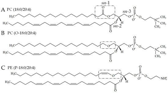 Chemical structures of phospholipids with ester, alkyl–ether, and vinyl–ether bonds at sn-1. The dotted boxes indicate (A) PC(18:0/20:4) with an ester bond, (B) PC(O-18:0/20:4) with an alkyl–ether bond, and (C) PE(P-18:0/20:4) with a vinyl–ether bond. FAs are linked to sn-1 and sn-2, and phosphocholine or phosphoethanolamine is linked to sn-3.
