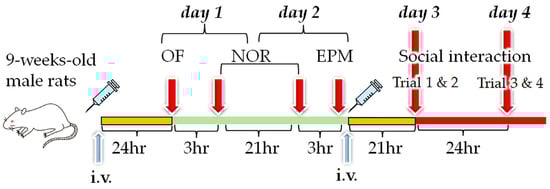 Anxiety-like behavior was examined using the EPM test on day 2 (Figure 2) [22]. The EPM arena consisted of four arms meeting at a central platform; there were two closed arms (50 × 10 cm) with 40 cm high walls and two open arms (50 × 10 cm) with no side walls. Rats were placed in the central square platform (10 × 10 cm) facing an open arm, and behavior was recorded for 5 min. The central platform was illuminated at 9 lux, the open arms at 8 lux, and the closed arms at 7 lux. The times spent in the central square platform, open arms, and closed arms were measured.