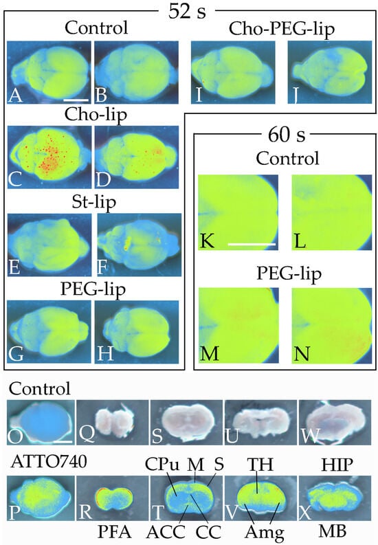 We prepared standard liposomes (St-lip), cholesterol-containing liposomes (Cho-lip), polyethylene-glycol-2000-containing liposomes (PEG-lip), and combined cholesterol- and polyethylene-glycol-2000-containing liposomes (Cho-PEG-lip). Liposome compositions are described in Table 1. St-lip, Cho-lip, PEG-lip, or Cho-PEG-lip (1 mL/kg body weight) (Table 1) was then injected into the mouse tail vein [17,18]. After 3 h, mice were anesthetized and euthanized by 2% isoflurane inhalation in air, and the harvested brains were scanned (excitation 540 nm, emission 600 nm) to observe DiIC18 (FUJIFILM Wako Pure Chemical) localization using a Newton 7.0 in vivo imaging system (Vilber-Lourmat, Collégien, France). DiIC18 exhibits environment-dependent fluorescence; it emits almost no fluorescence in aqueous environments but exhibits substantial fluorescence enhancement when incorporated into cell membranes or bound to lipophilic biomolecules. To verify the localization of the injected phospholipids, liposomes composed of egg PC (8 mg/mL) and ATTO 740 DOPE (2 mg/mL) (ATTO-TEC GmbH, Siegen, Germany) were also injected into mice. ATTO 740 DOPE emits fluorescence of a long wavelength (763 nm); fluorescence deep within the brain is therefore easily detected not only through the brain surface, but also in thick sections using in vivo imaging systems. Moreover, the localization of the phospholipids themselves was able to be observed through liposome transfer into the brain. Because the blood–brain barrier (BBB) might be affected by ATTO dye linked to the hydrophobic moiety when ATTO 740 DOPEs are arranged at the outer leaflet of the liposomes, we confirmed the brain localizations of the injected phospholipids by comparing two methods: DiIC18 and ATTO 740 DOPE. In injection of ATTO 740 DOPE, mice underwent perfusion fixation with 4% paraformaldehyde solution at 3 h after liposome injections. The brains were then washed with saline, and the fluorescence was detected from the surface of the brain and in 1 mm thick coronal sections using an in vivo imaging system.