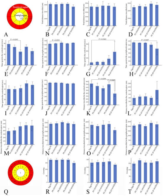 Total distance traveled did not differ among the phospholipids examined in the OF test (Figure 6A–D). Times spent in the central and peripheral regions were significantly shorter and longer, respectively, in the PE(18:0/22:6) group compared with the control egg PC group; however, no significant changes were noted in the PE(18:0/18:0), PE(18:0/20:4), or PE(P-18:0/20:4) groups (Hsu’s MCB test) (Figure 6E,F). Furthermore, times spent in the central and peripheral regions in the OF test were significantly longer and shorter, respectively, in the PE(O-16:0/22:6) group compared with the egg PC group, whereas these times were not changed by PC(16:0/22:6), PC(O-16:0/22:6), PC(O-18:0/22:6), PC(18:0/20:0), PC(18:0/20:4), PC(O-18:0/20:4), or PC(P-18:0/20:4) injection (Figure 6G–J). Although the distance traveled in the central region was significantly shorter in the PE(P-18:0/20:4) group than in the PE(18:0/20:4) or control groups, this distance was not changed by PE(18:0:0/18:0), PE(18:0/20:4), PE(18:0/22:6), PE(O-16:0/22:6), PC(16:0/22:6), PC(O-16:0/22:6), PC(18:0/20:0), PC(18:0/20:4), PC(O-18:0/20:4), PC(P-18:0/20:4), or PC(O-18:0/22:6) injection (Figure 6K–M). The distance traveled in the peripheral region and the number of crossings were not altered by any of the PCs or PEs examined in the present study (Figure 6N–T).