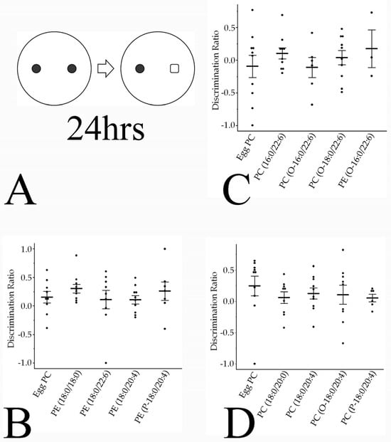 Phospholipids do not alter object recognition memory as expressed by the discrimination ratio. (A) Rats explored two brown cylindrical bottles placed in the arena for 10 min; 24 h later, one of the two objects was replaced with a clear square bottle filled with white molecular sieves, and the tested rats were again allowed to explore both objects for 10 min. (B–D) Values are presented as the mean ± standard error. The rat numbers in each group were as follows: (B) Egg PC (n = 9), PE(18:0/18:0) (n = 10), PE(18:0/22:6) (n = 9), PE(18:0/20:4) (n = 10), and PE(P-18:0/20:4) (n = 7). (C) Egg PC (n = 10), PC(16:0/22:6) (n = 10), PC(O-16:0/22:6) (n = 6), PC(O-18:0/22:6) (n = 10), and PE(O-16:0/22:6) (n = 3). (D) Egg PC (n = 10), PC(18:0/20:0) (n = 9), PC(18:0/20:4) (n = 10), PC(O-18:0/20:4) (n = 9), and PC(P-18:0/20:4) (n = 6). Differences were evaluated using Hsu’s MCB test.