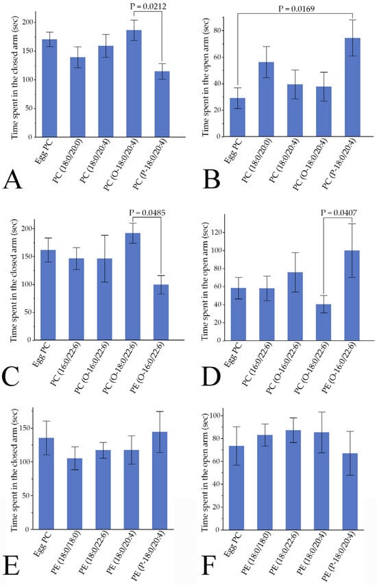 The EPM test was used to examine anxiety-like behaviors. Time spent in the closed arm was significantly shorter in rats injected with PC(P-18:0/20:4) than in those injected with PC(O-18:0/20:4) (Hsu’s MCB test), and time spent in the open arm was significantly longer in the PC(P-18:0/20:4) group than in the egg PC group (Figure 8A,B). Additionally, the times spent in the closed and open arms were significantly shorter and longer, respectively, in rats injected with PE(O-16:0/22:6) than in those injected with PC(O-18:0/22:6) (Figure 8C,D). The other phospholipids examined in the current study did not affect anxiety-like behaviors (Figure 8A–F).
