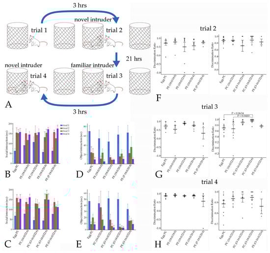 In the social interaction tests (Figure 9A), rats were introduced to novel and familiar intruders. Social interactions with both novel and familiar intruders were inhibited in the rats injected with PE(18:0/18:0), PE(18:0/22:6), PC(O-16:0/22:6), and PE(O-16:0/22:6). By contrast, social interactions with intruder rats were not inhibited by PE(18:0/20:4), PE(P-18:0/20:4), or PC(O-18:0/22:6) injection (Figure 9B,C). Injection with PC(16:0/22:6) led to the partial inhibition of social interactions (Figure 9C). Object interactions were not inhibited in the PE(18:0/22:6), PE(P-18:0/20:4), PC(16:0/22:6), or PC(O-16:0/22:6) groups (Figure 9D,E). The discrimination ratio was significantly higher in the PC(O-18:0/22:6) group than in the PC(16:0/22:6) group (p = 0.0410), and tended to be higher in the PC(O-18:0/22:6) group than in the egg PC group (p = 0.0634) (Hsu’s MCB test) in trial 3. There were no significant differences in discrimination ratios between the other groups in trials 1–4 (Figure 9F–H).