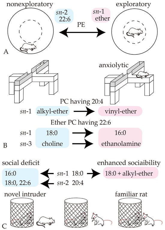 The impact of phospholipid moiety substitutions on behaviors. (A) DHA at sn-2 and an ether linkage at sn-1 in PE may control exploratory behaviors. (B) A vinyl–ether linkage at sn-1 in PC with 20:4, and palmitic acid at sn-1 and the substitution of choline with ethanolamine at sn-3 in PC with 22:6, may reduce anxiety-like behaviors. (C) Palmitic acid at sn-1 and stearic acid and DHA at sn-2 may reduce sociability. By contrast, alkyl–ether linkage and stearic acid at sn-1 may combine to enhance social interaction with a familiar rat.