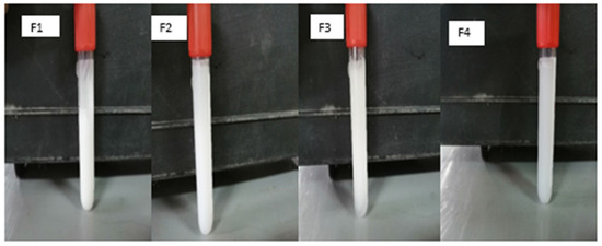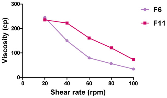 For example, F11 at shear rates of 20 rpm and 40 rpm was 235 cp and 222 cp, respectively. This type of behavior under stress conditions is called shear thinning [46].
