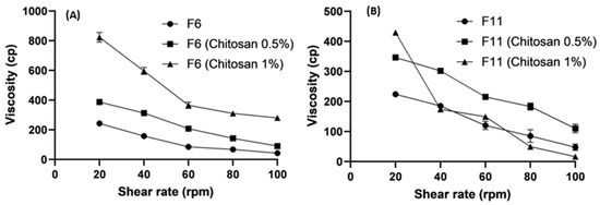 Rheological profiles (viscosity vs. shear rates) of bare and chitosan-coated SLNs; (A,B) were bare and chitosan-coated F6 and F11, respectively. Data points represent means ± SD, n = 3.