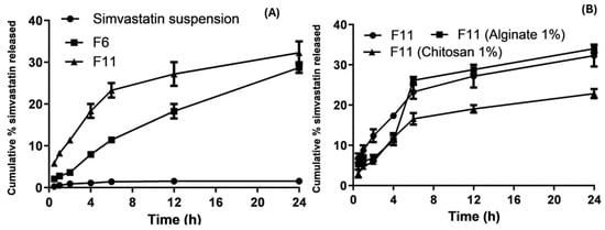 In vitro drug release profile of simvastatin suspension, bare F6 and F11 (A); and bare F11, coated F11 with alginate (1%) and chitosan (1%) (B) at pH 1.2 and pH 6.8. Data points represent means, n = 3.