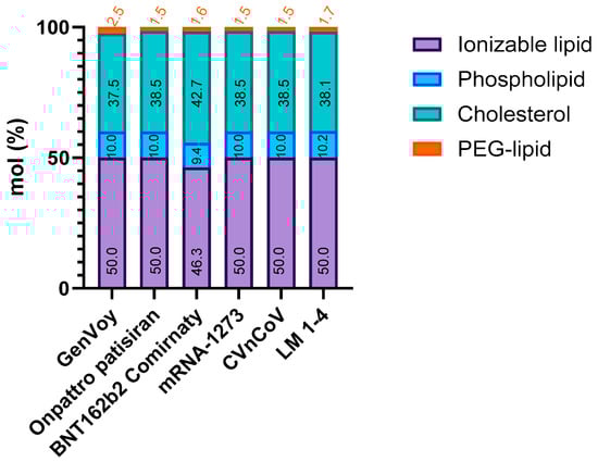 - Lee, Y.; Jeong, M.; Park, J.; Jung, H.; Lee, H. Immunogenicity of lipid nanoparticles and its impact on the efficacy of mRNA vaccines and therapeutics. Exp. Mol. Med. 2023, 55, 2085–2096. [Google Scholar] [CrossRef] [PubMed]