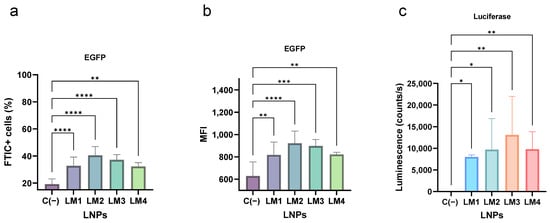 3.3. EGFP mRNA Transfection by LNP Formulations in HepG2 and Dendritic Cell Lines
