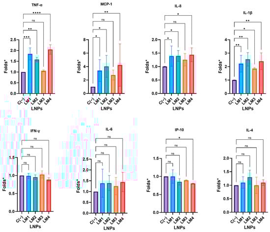 3.4. mRNA Transfection and Cytokine Secretion by PBMCs Treated with LNPs