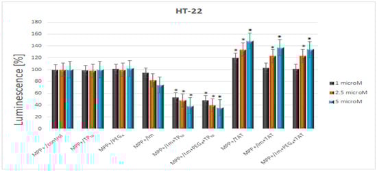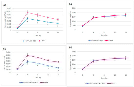 Sequentially repeated measurements of luminescence (A1–A5) and fluorescence (B1–B5) in MPP+ treated HT-22 cells after administration of the following: (A1,B1) TP10; (A2,B2) PEG4; (A3,B3) Im; (A4,B4) Im+TP10; and (A5,B5) Im+PEG4+TP10. * Statistically significant (p < 0.05) as compared to the control.
