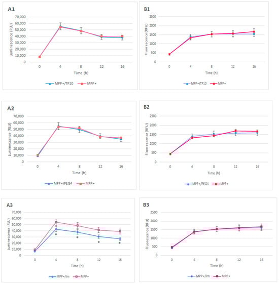 TP10 as well as PEG4 caused almost the same changes in the luminescence intensity as MPP+. Therefore, the curves reflecting them are overlapping (A1 and A2).