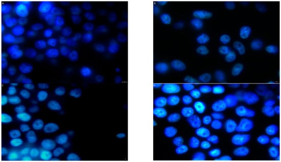 Figure 3 shows fluorescent images of the HT-22 cells whose nuclei became visible due to the HO3342 blue dye. These images show the number of cells under control conditions (Figure 3A), after exposure to MPP+ (Figure 3B), and after exposure to MPP+ plus the following tested compounds: imatinib (Figure 3C) or imatinib+PEG4+TP10 (Figure 3D). In the control, there was a considerable number of cells (Figure 3A) that constituted a reference for those obtained after the treatment. Figure 3B indicates an evident decrease in the number of HT-22 cells due to MPP+ exposition. A cytoprotective effect was observed after the administration of imatinib (Figure 3C) and especially after the administration of imatinib+PEG4+TP10 (Figure 3D). The action of the latter compound was really impressive; the number of cells in Figure 3D is comparable to that observed in the control (Figure 3A).