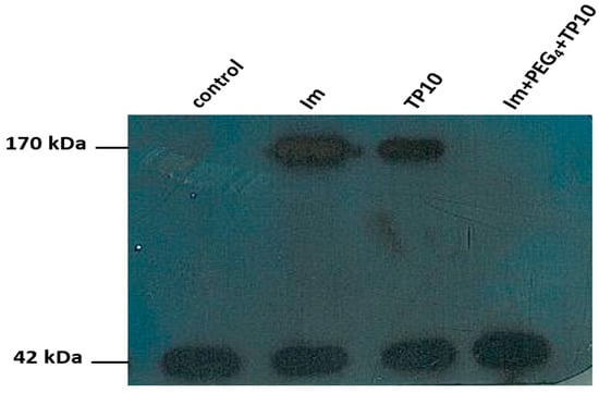 Figure 4 presents changes in the level of the ABCB1 protein induced by the treatment of the compounds in question. Under the control conditions, there were no visible levels of the 170 kDa ABCB1 protein detected. On the other hand, imatinib as well as TP10 evidently activated this protein. Interestingly, there was no activation of the ABCB1 protein due to the incubation with the non-covalent conjugate imatinib+PEG4+TP10.