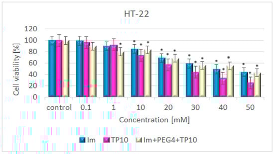 The impact of Im, TP10, and Im+PEG4+TP10 on HT-22 cell viability. * Statistically significant (p < 0.05) as compared to the control.