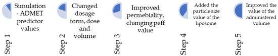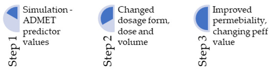 Similarly to MDP and MTP-PE, logP changes did not impact absorption. However, increasing the Peff value improved absorption. According to the software, the minimum Peff value that would indicate the best absorption is 0.6. Changing the Peff value was enough to ensure proper dissolution and absorption of the drug. The “Absorption No” window turned green. Figure 3 summarizes all the steps involved in the preparation of the Murabutide model.