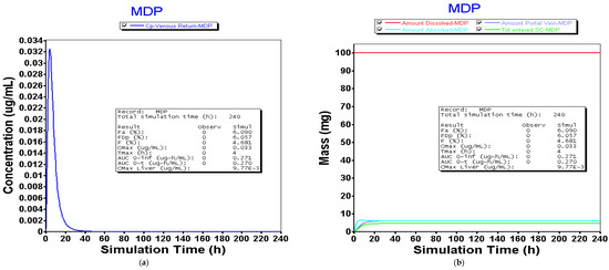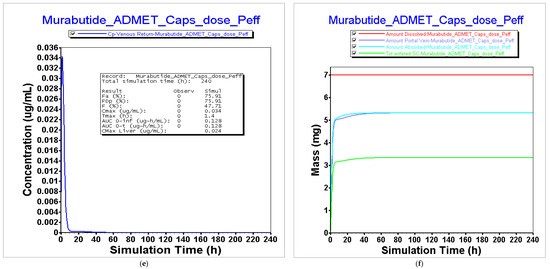 Figure 4a,b assumed ADMET predictor values for a 100 mg tablet. Since the formulation of alpha-tocopherol is integrated in a capsule, this parameter and the volume were changed accordingly. Cmax was 1.31 × 10−3 ug/mL according to Figure 4c. On Figure 4b, it is possible to see that the dose of 4 mg was entirely dissolved. However, according to the green and blue lines, this amount of drug is not being metabolized (low amount of dosage in Portal Vein), is not being absorbed and has not entered systemic circulation (green line). This was caused by the poor permeability of the compound. Therefore, the effective permeability value (peff) was improved by assuming that an enhancer of the permeability was added to this formulation, and it was possible to verify in Figure 4e that Cmax improved to 0.05 mL. On Figure 4d, it is possible to see that metabolism and absorption already occurred. Results from Figure 4d,e will be the ones used to compare the behavior of MDP with their derivates (MDP-PE and murabutide).