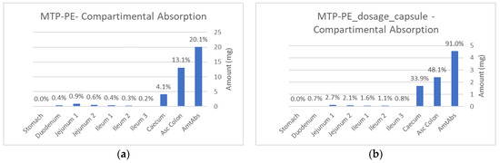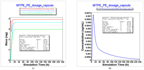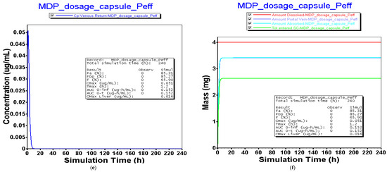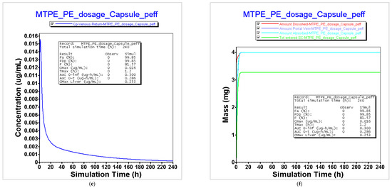 Figure 6a,b represents the standard predictions from the software. In Figure 6c,d the dosage form was changed to capsules and 4 mg. As can be seen, the absorption and systemic circulation were still extremely poor after these changes. After improving the Peff, we could see an improvement in the absorption Figure 6e,f. All parameters in the compound tab were green, which meant the model was finally optimized. The capsule formulation with a dosage of 7 mg and a Peff of 0.6 was used to compare with the optimized models of MPD and MTP-PE.