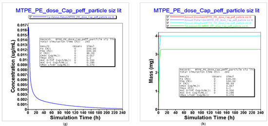 In Figure 5e,f, it is possible to verify that absorption increased as indicated by the blue line on Figure 5f and the Cmax also increased. Since MEPACT, the commercialized product of the MTP_PE is a liposome (L-MTP-PE) it was possible to find in the literature its particle size and this was included in the software. Some parameters slightly improved such as Cmax. Although there was not a great difference between Figure 5e or Figure 5f and Figure 5g or Figure 5h since there were small improvements, as the liposome is the commercialized version, we kept the liposome particle size in our model.