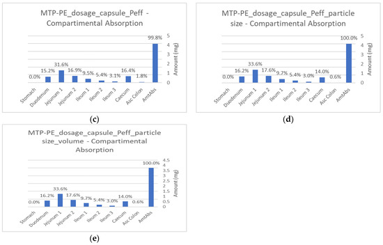 MTP-PE (a) Compartmental absorption without experimental data (ADMET predictor only); (b) Compartmental absorption with capsule on dosage form, dose 4 mg and volume 200 mL (c) Compartmental absorption with capsule on dosage form, dose 4 mg and volume 200 mL and Peff of 1.0 (d) Compartmental absorption with capsule on dosage form, dose 4 mg and volume 200 mL and Peff of 1.0 and particle size of 2 μm (e) Compartmental absorption with capsule on dosage form, dose 4 mg and volume 200 mL.