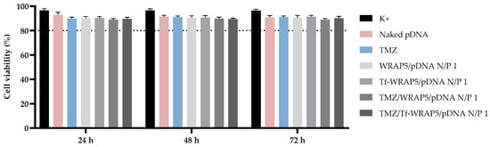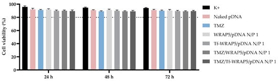 Cellular viability of CTX-TNA2 cells after 24 h, 48 h, and 72 h of transfection mediated by the different peptide/pDNA complexes developed at N/P ratio of 1 (using 1 µg pDNA). Cells not transfected were used as a positive control and cells treated with naked pDNA and TMZ drug were used as controls. Data were obtained from six independent measurements (mean ± SD, n = 6).