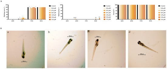 (A) Effects of TMZ drug in Danio rerio zebrafish embryo–larval hatching success, malformations, and survival over time after exposure to a range of concentrations of 0–5.15 µM of TMZ drug. (B) Larval stereomicroscope images of control (a), DMSO solvent (b), and concentration of 1 mg TMZ drug/L (c,d) after 96 h of exposure. Scale bar = 1000 μm. ns—non-significant (p > 0.5).