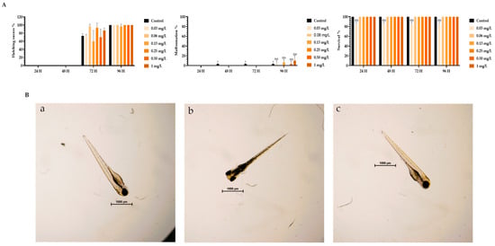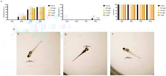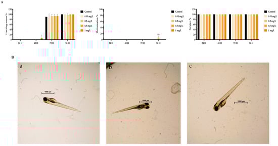 (A) Effects of plasmid DNA (pDNA) in Danio rerio zebrafish embryo–larval hatching success, malformations, and survival over time after exposure to a range of concentrations of 0–1 mg of pDNA/L. (B) Larval stereomicroscope images of control (a), and concentration of 1 mg pDNA/L (b,c) after 96 h of exposure. Scale bar = 1000 μm. ns—non-significant (p > 0.5).