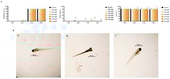 (A) Effects of TMZ/Tf-WRAP5 peptide in Danio rerio zebrafish embryo–larval hatching success, malformations, and survival in time after exposure to a range of concentrations of 0–2 mg of TMZ/Tf-WRAP5 peptide/L. (B) Larval stereomicroscope images of control (a), and concentration of 2 mg TMZ/Tf-WRAP5 peptide/L (b,c) after 96 h of exposure. Scale bar = 1000 μm. ns—non-significant (p > 0.5).